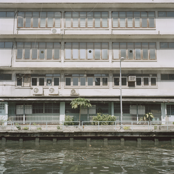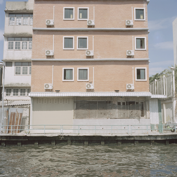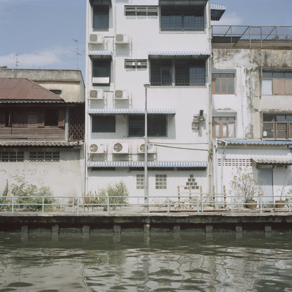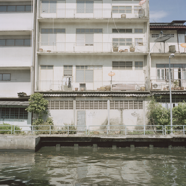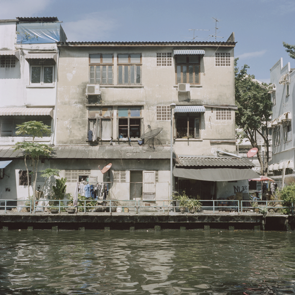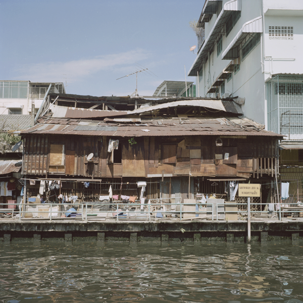 Wohnsituationen von Menschen in Bangkok entlang einer Wasserstraße.
